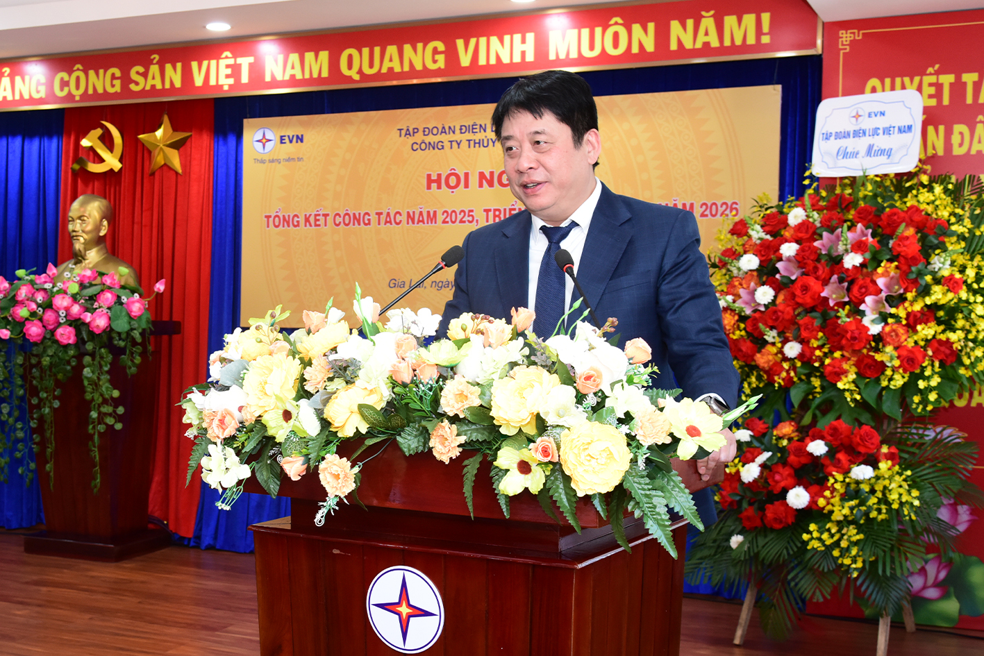 Sáng nay (09.01.2026), tại Văn phòng Công ty (Phường Thống Nhất, tỉnh Gia Lai), Công ty Thủy điện Ialy tổ chức Hội nghị tổng kết công tác Đảng, công tác chuyên môn năm 2025 và triển khai nhiệm vụ năm 2026. Hội nghị được đón đồng chí Nguyễn Anh Tuấn-Phó Bí thư Đảng ủy-Tổng giám đốc Tập đoàn, Bùi Công Luận-UVBCH Đảng bộ, Chánh Văn phòng, Mai Thị Thúy An-Phó Chủ nhiệm UBKT Đảng ủy Tập đoàn và đại diện các Ban chuyên môn về dự và chỉ đạo. Về phía Công ty Thủy điện Ialy có đồng chí Đoàn Tiến Cường-Ủy viên BCH Đảng bộ Tập đoàn, Bí thư Đảng ủy, Giám đốc Công ty; Các thành viên BCH Đảng bộ, Ban giám đốc, trưởng, phó các đơn vị và 80 CBCNV.