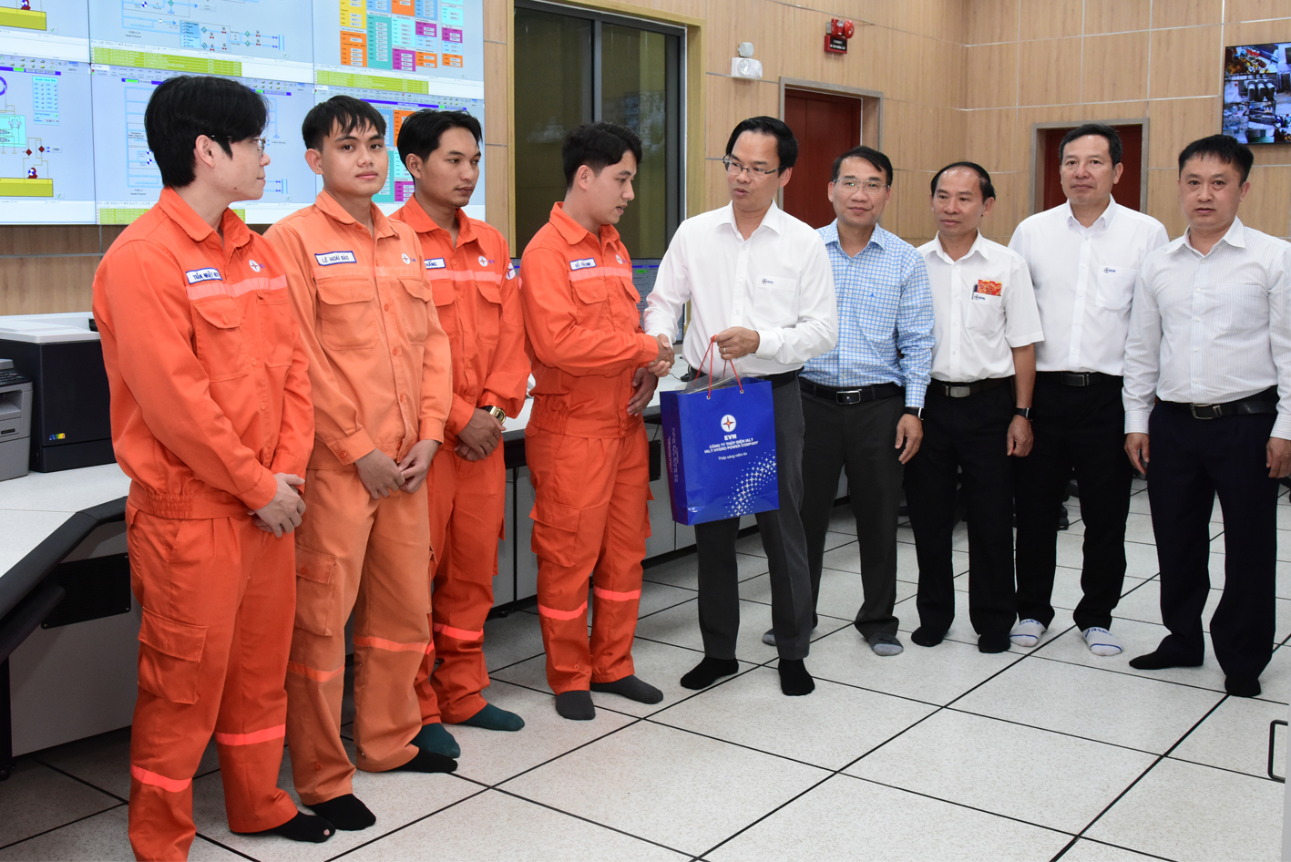 Giám đốc Đoàn Tiến Cường và Chủ tịch công đoàn Nguyễn Văn Bình tặng quà người lao động trực vận hành tại phòng điều khiển trung tâm Nhà máy Thủy điện Ialy