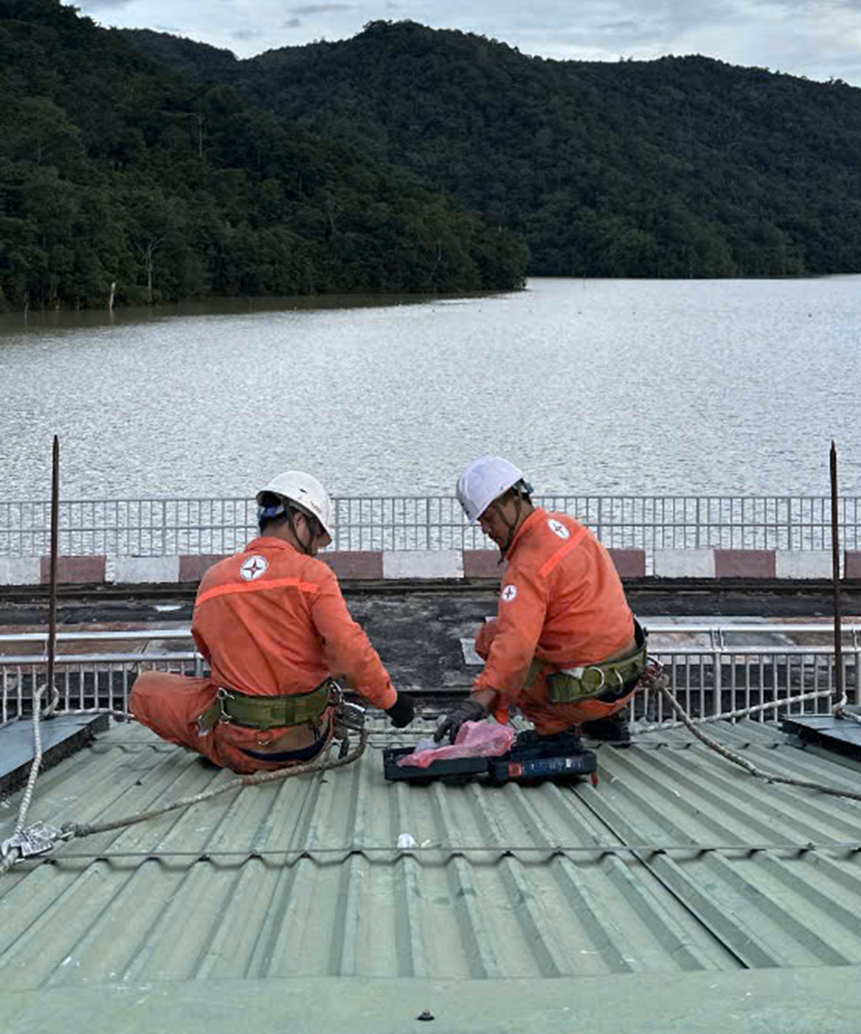 Gia cố công trình trọng yếu: Lắp đặt bổ sung các thanh la để giằng, gia cố mái tôn tại các nhà điều khiển van cung của đập tràn, tăng khả năng chống chịu gió giật mạnh. (Như hình ảnh ghi nhận, công nhân đang làm việc trên mái nhà điều khiển).