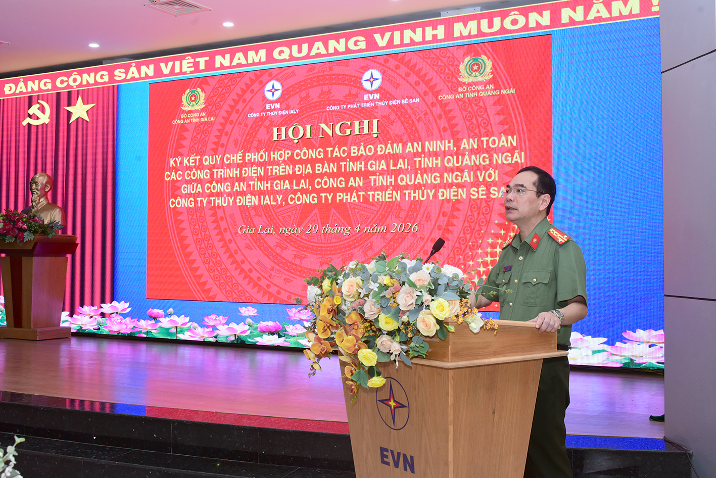 Tham dự Hội nghị có Đại tá Phạm Hữu Trường-Phó Giám đốc Công an tỉnh Gia Lai; Đại tá Võ Văn Dương-Phó Giám đốc Công an tỉnh Quảng Ngãi; ông Đoàn Tiến Cường-Giám đốc Công ty Thủy điện Ialy, ông Nguyễn Đăng Hà Giám đốc Công ty phát Thủy điện Sê San cùng các phòng nghiệp vụ thuộc Công an 2 tỉnh, công an các phường, xã nơi có các nhà máy thủy điện đóng chân.