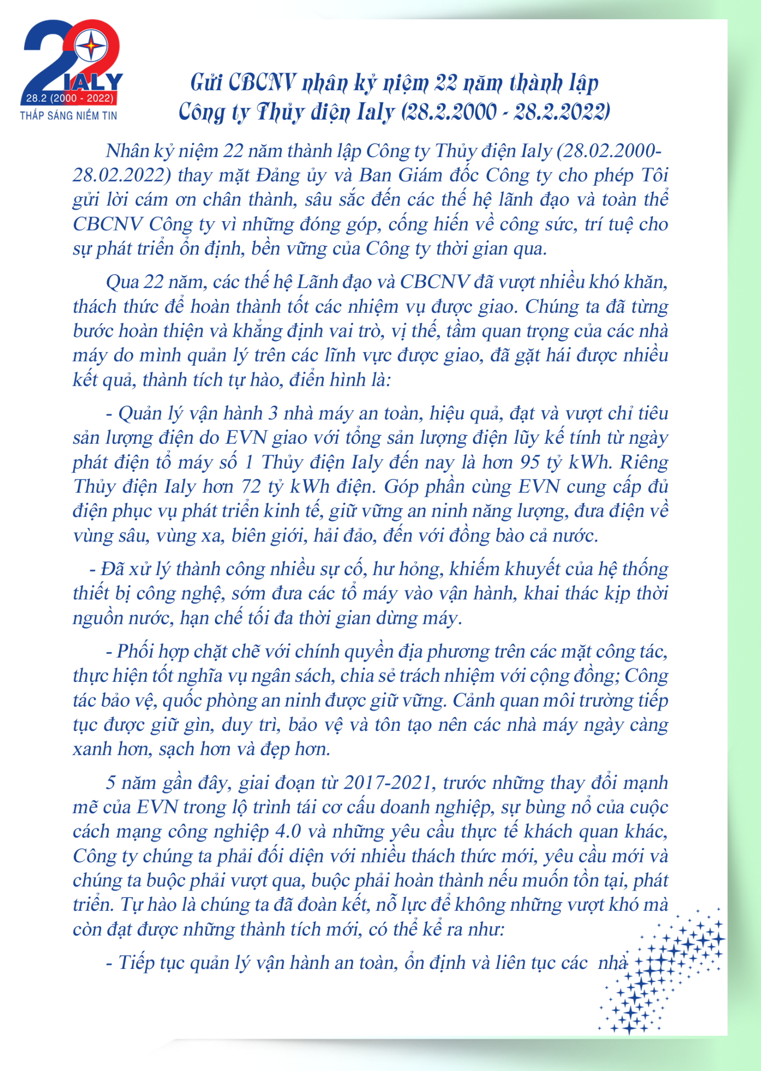 Thư của Giám đốc Công ty Thủy điện Ialy gửi CBCNV nhân kỷ niệm 22 năm ngày thành lập