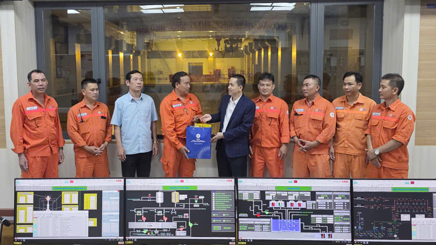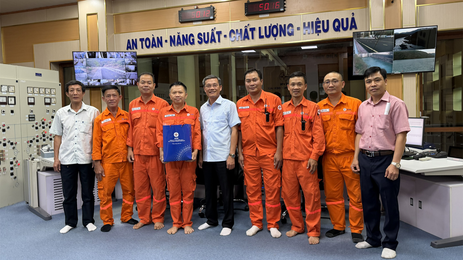 Giám đốc Đoàn Tiến Cường và Chủ tịch công đoàn Nguyễn Văn Bình tặng quà người lao động trực vận hành tại phòng điều khiển trung tâm Nhà máy Thủy điện Ialy
