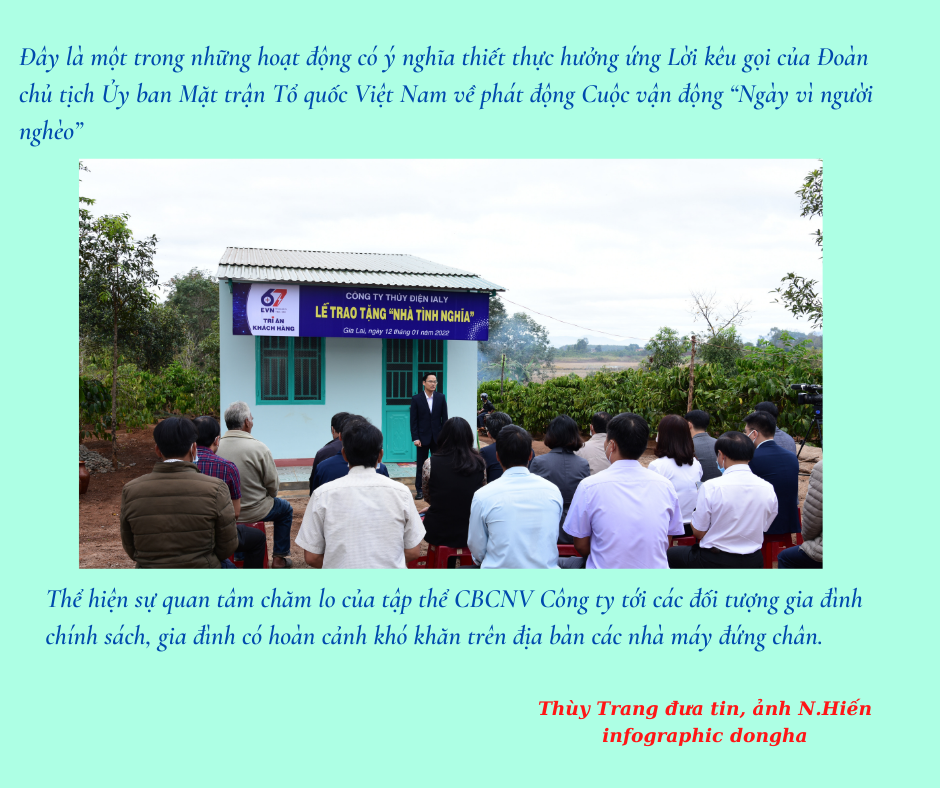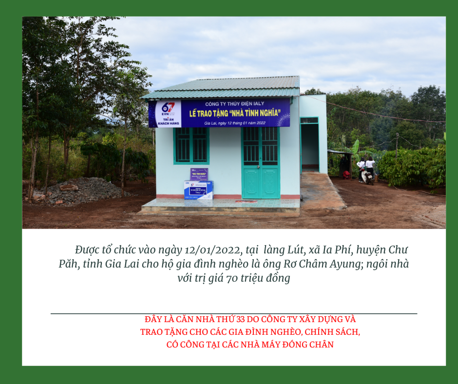 Được trao cho gia đình ông Rơ Châm Ayung vào ngày 12.01.2022, tại làng làng Lút, xã Ia Phí, huyện Chư Păh, tỉnh Gia Lai. Đây là căn nhà thứ 33 do CBCNV Công ty Thủy điện Ialy xây dựng và tặng cho các gia đình nghèo, gia đình chính sách, có công tại các nhà máy đóng chân