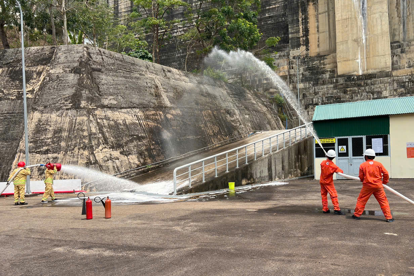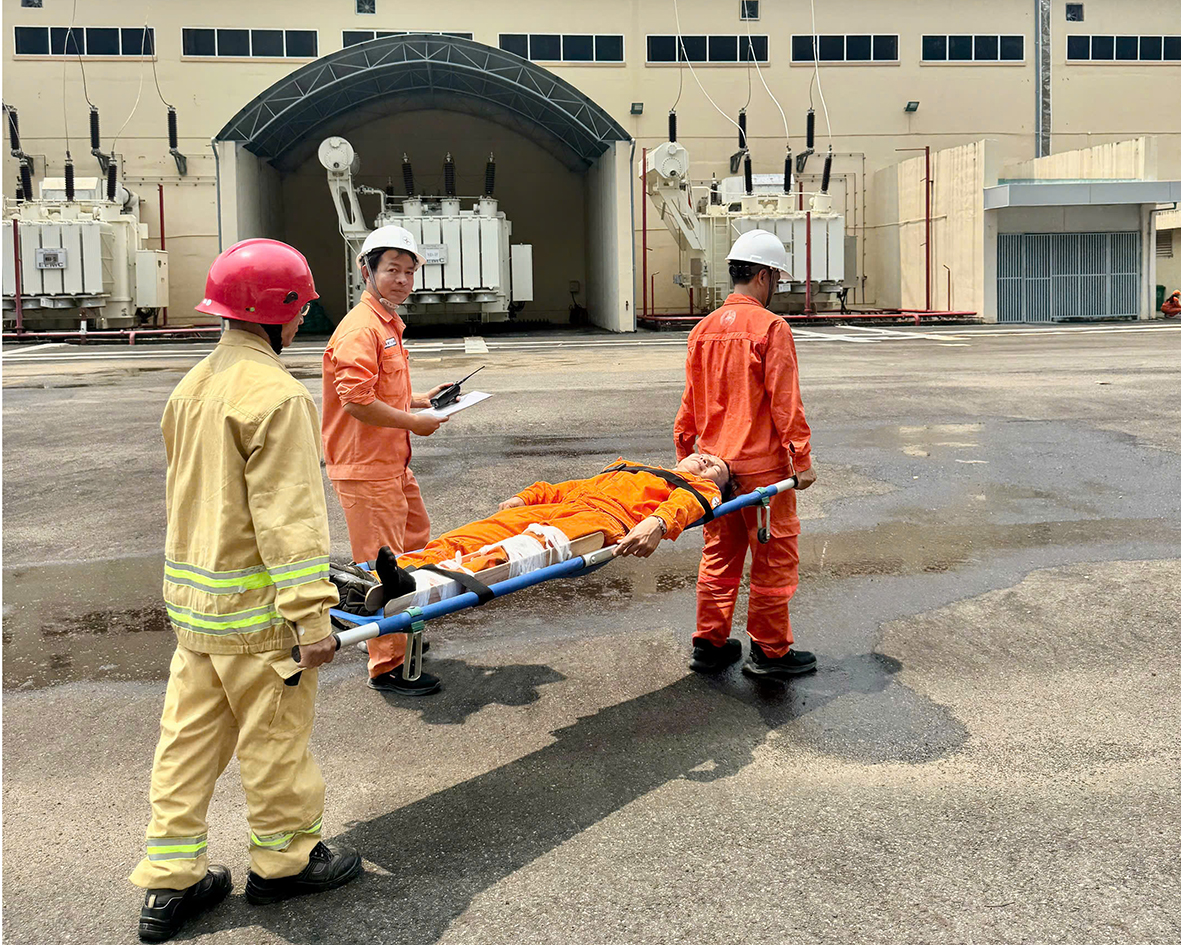 Tình huống giả định “Trạm 110 kV, MBA tự dùng TD3 mất điện, máy phát H1, H2 dừng sự cố do bảo vệ 81O tác động; Khi đi kiểm tra trạm bơm rò rỉ nhà máy tại cao trình 502m, một người bị trượt ngã gây vết thương ở cánh tay; Có đám cháy lớn tại máy phát điện Diesel; Tình huống cứu nạn, cứu hộ tai nạn lao động: có 1 người trượt ngã gãy xương cẳng chân khi tham gia chữa cháy máy phát điện Diesel.