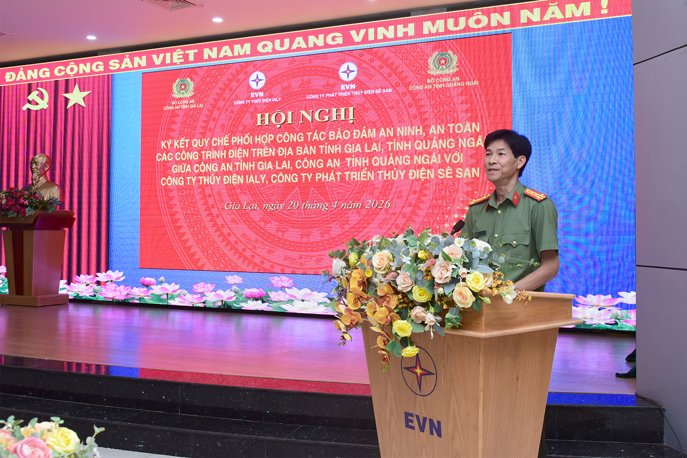 Tham dự Hội nghị có Đại tá Phạm Hữu Trường-Phó Giám đốc Công an tỉnh Gia Lai; Đại tá Võ Văn Dương-Phó Giám đốc Công an tỉnh Quảng Ngãi; ông Đoàn Tiến Cường-Giám đốc Công ty Thủy điện Ialy, ông Nguyễn Đăng Hà Giám đốc Công ty phát Thủy điện Sê San cùng các phòng nghiệp vụ thuộc Công an 2 tỉnh, công an các phường, xã nơi có các nhà máy thủy điện đóng chân.