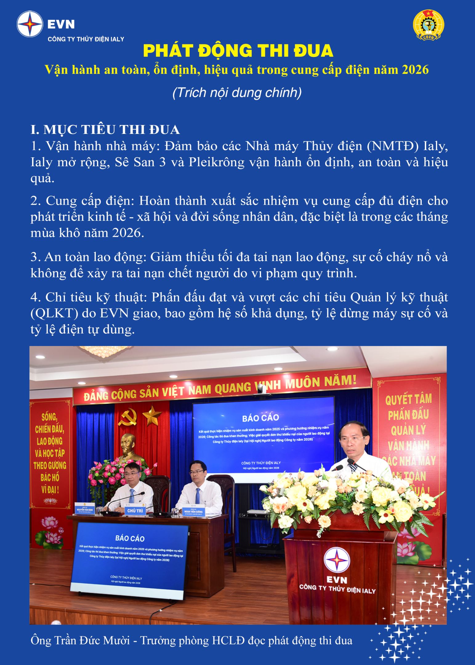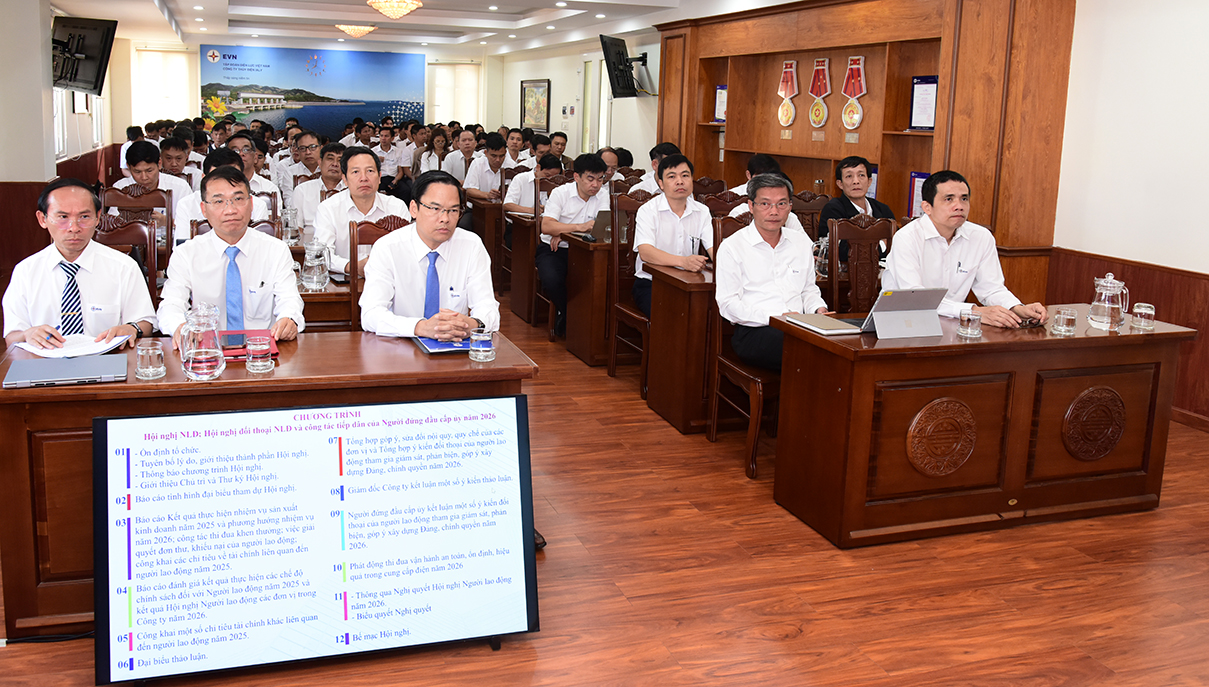 Báo cáo Kết quả thực hiện nhiệm vụ sản xuất kinh doanh năm 2025 và phương hướng nhiệm vụ năm 2026; công tác thi đua khen thưởng; việc giải quyết đơn thư, khiếu nại của người lao động; công khai các chỉ tiêu về tài chính liên quan đến người lao động năm 2025 do ông Trần Đức Mười, Trưởng phòng Hành chính và Lao động trình bày. Báo cáo đánh giá kết quả thực hiện các chế độ chính sách đối với Người lao động năm 2025 và kết quả Hội nghị Người lao động các đơn vị trong Công ty năm 2026 do ông Nguyễn Văn Bình, Chủ tịch Công đoàn trình bày.