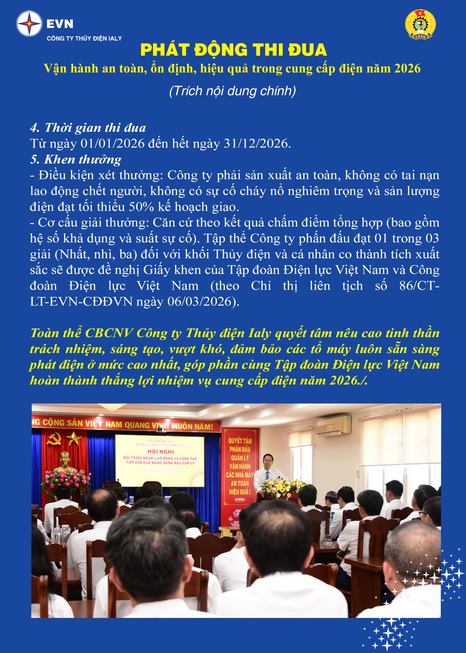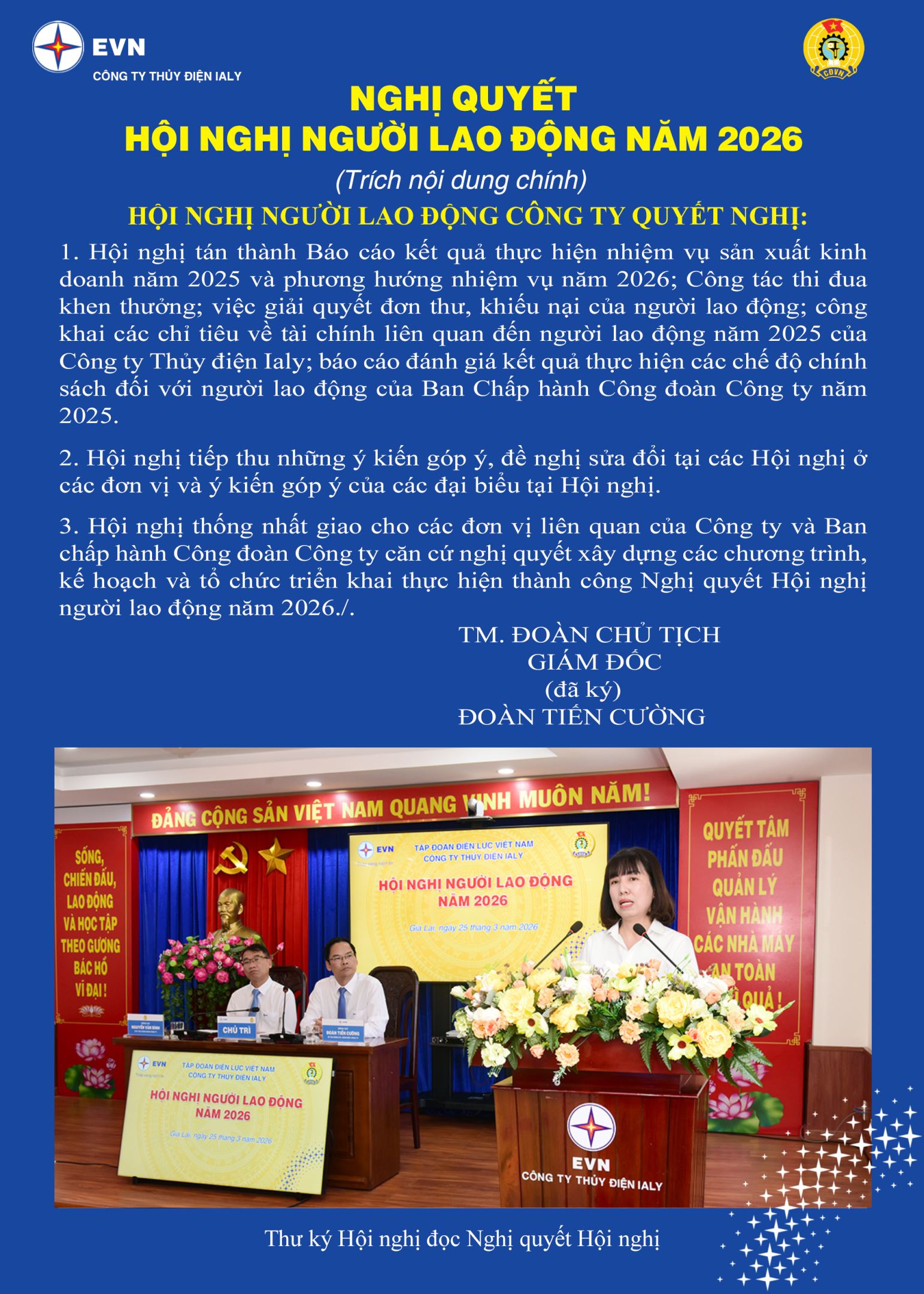 Sáng nay (25.3.2026), tại Văn phòng Công ty, (phường Thống Nhất, tỉnh Gia Lai) đã diễn ra Hội nghị Người lao động năm 2026. Ông Đoàn Tiến Cường, Giám đốc Công ty và Ông Nguyễn Văn Bình, Chủ tịch Công đoàn đồng chủ trì. Tham dự có 100 CBCNV đại diện cho người lao động toàn đơn vị.